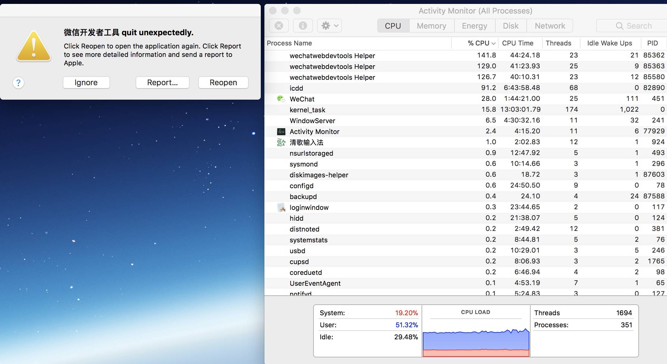 开发者工具空闲一段时间就会异常退出,且留下多个helper进程占大量cpu。