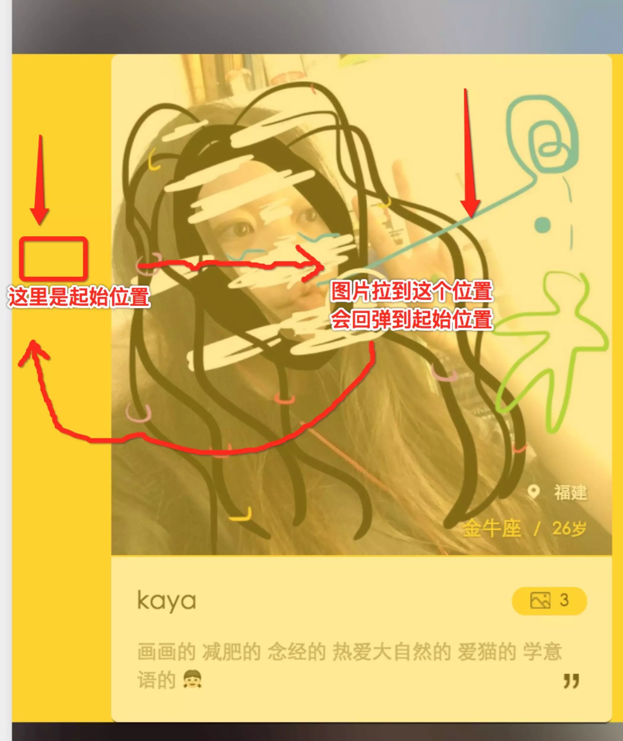 我要做的效果是touchend 后 卡片的透明度为0.5。 现在出现的问题是不改变透明度,卡片拉到哪里就在哪里,加上透明度,卡片拉到一个位置会回到初始的位置。