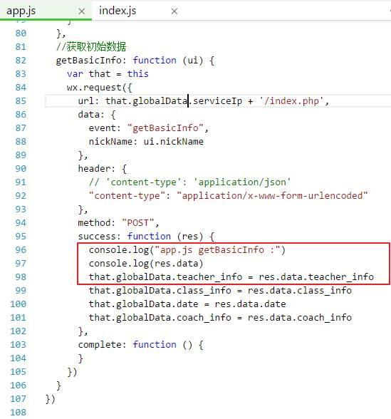 我在app.js中 wx.request ,然后把返回的数据赋值给globalData数组,还在index.js页面中可以获取globalData数组中赋值的数据,但是好像app.js给globalData数组赋值的速度太慢了,还没等赋值结束,它就访问index.js,这时候值还没有拿到,就去访问了globalData数组,结果就打印出了undefined,然后才打印app.js中的console.log。