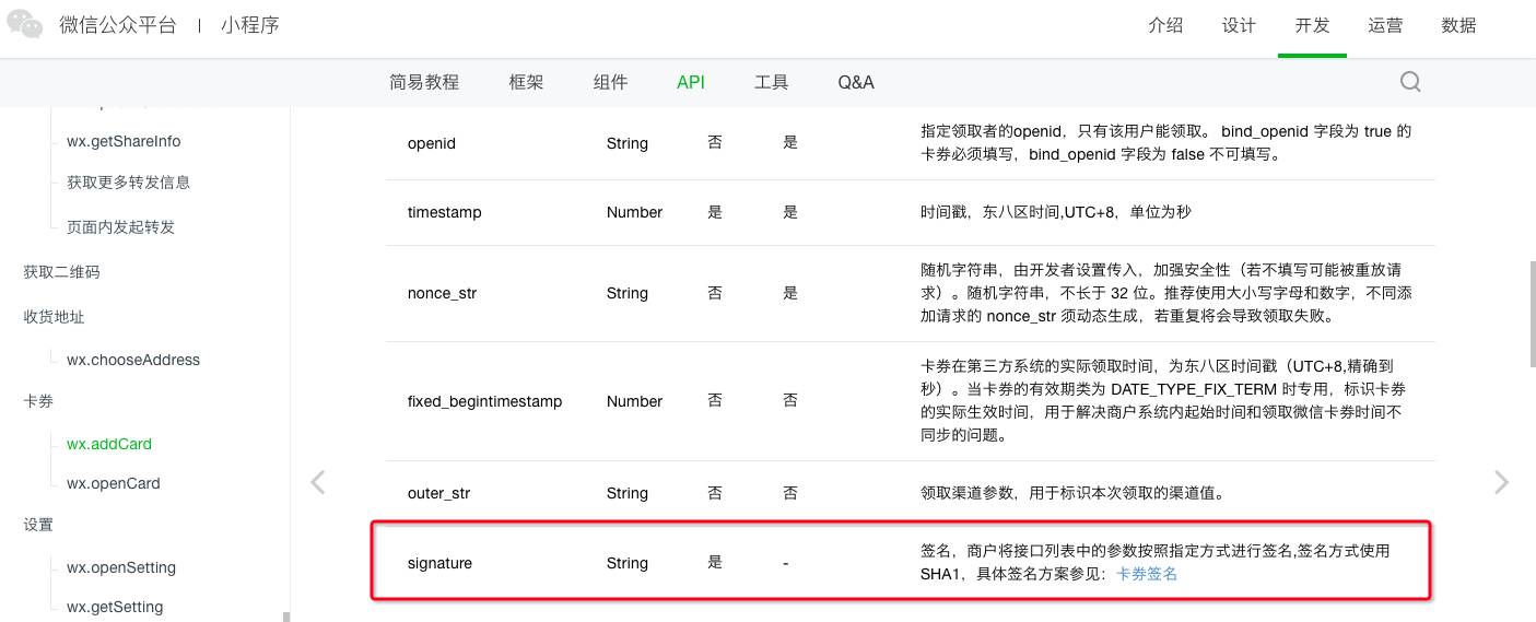 在做小程序卡券的时候,调用接口wx.addCard(),其中需要一个签名的参数: