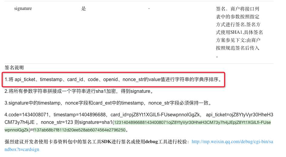 签名说明中第一条提示,将一些必要的参数的value值进行字符串的字典排序。并且在第四条的示例中,sha1加密的内容也是根据第一条的要求进行的排序。但是点进最后链接给到的debug校验工具,排序结果却和生成规则不同: