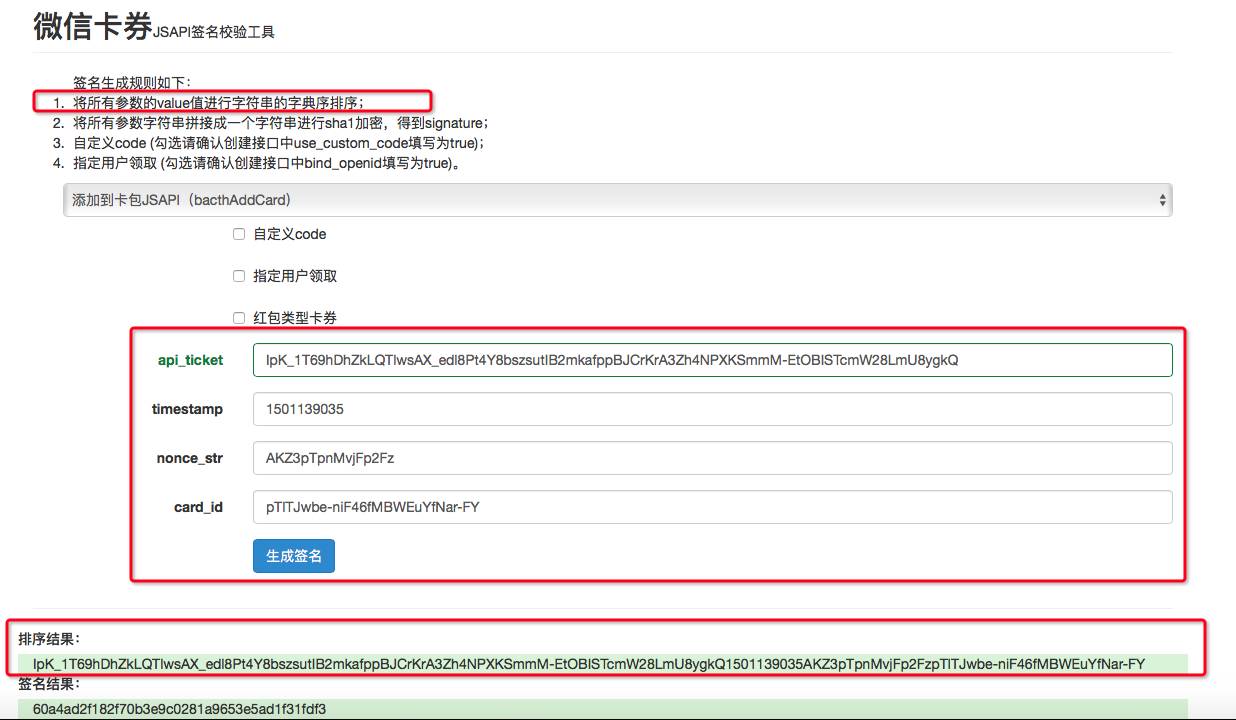 并且不论是使用文档提示的按照value字典排序后生成的signature,还是根据工具生成的signature,小程序的wx.addCard()一直提示签名错误。