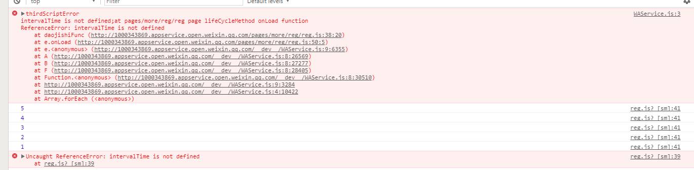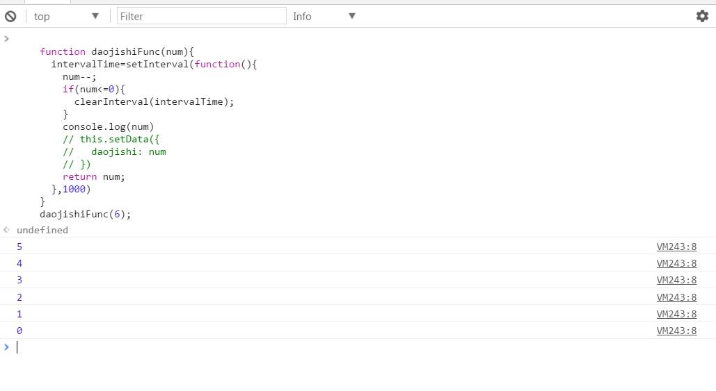 onLoad: function (options) { function daojishiFunc(num){ intervalTime=setInterval(function(){ num--; if(num<=0){ clearInterval(intervalTime); } console.log(num) // this.setData({ // daojishi: num // }) return num; },1000) } daojishiFunc(6); // daojishiFunc(this.data.daojishi);}, |