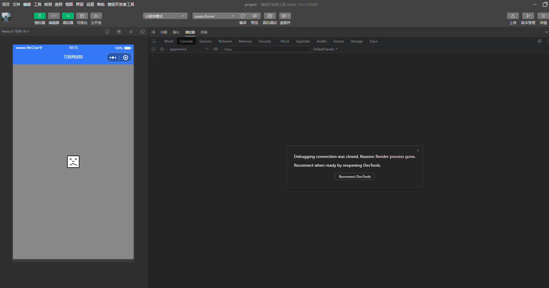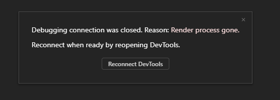 二楼说的应该是这个截图 我的也出现了,没有什么特殊代码,点击按钮reconnect DevTools,导致打不开调试区,重起开发者还是会出现