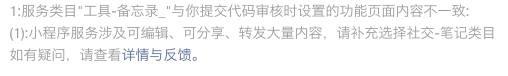 你好,经核实,贵方小程序提供服务确实涉及用户自定义内容的记录及分享(包括文字、图片、视频、音频等),需补充登记社交-笔记类目;