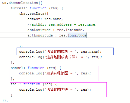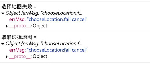 问题二、进入选择地图页面后,没点完成,只接返回,cancel,fail都被执行,取消调用和调用失败到底是指啥?取消调用意味着调用失败?所以两都执行,想分开咋办?或者在选择地图页面如果有fail,就在当前页面体现