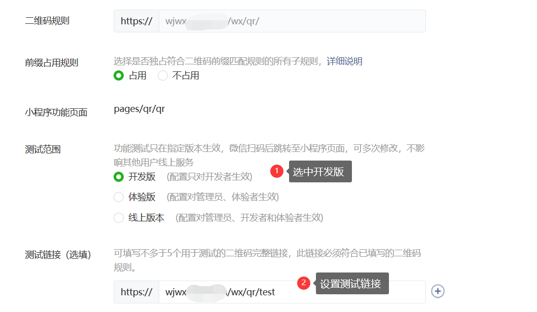 然后使用测试连接生成一个二维码,再使用微信扫描该二维码就会跳转到对应版本的小程序了