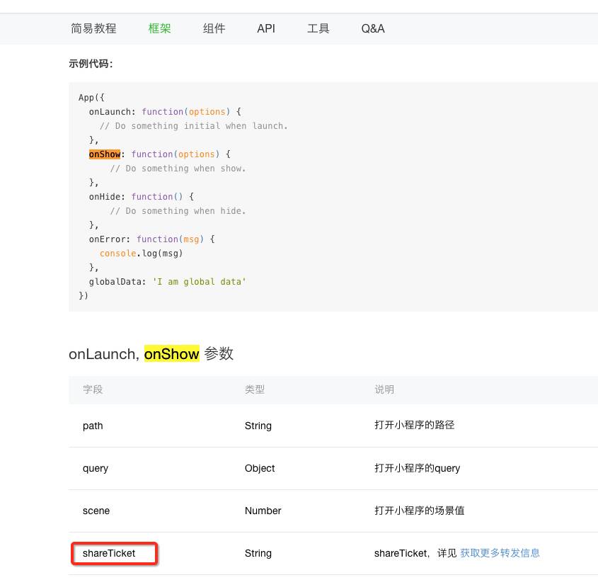 最后,文档写的在App.onShow内是可以获取到shareTicket,结果没有获取到,应该是基础库bug,希望能够尽快修复