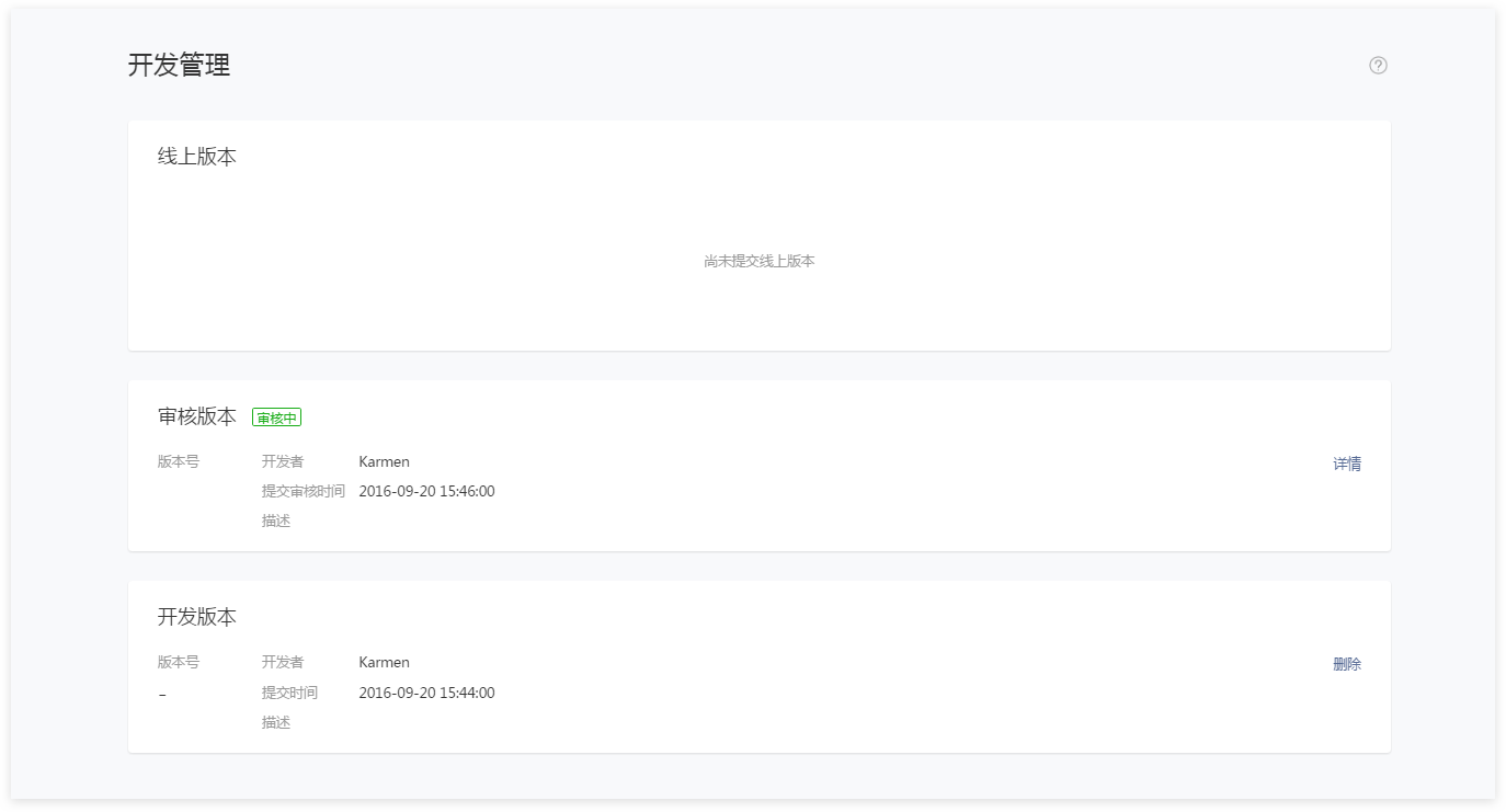 前面提到了「提交」这个词。和订阅号、服务号不一样,你发文章不需要通过微信审核,你改按钮功能也不需要,但小程序的每个版本更新,都必须通过微信审核 — 就像 App Store 那样。