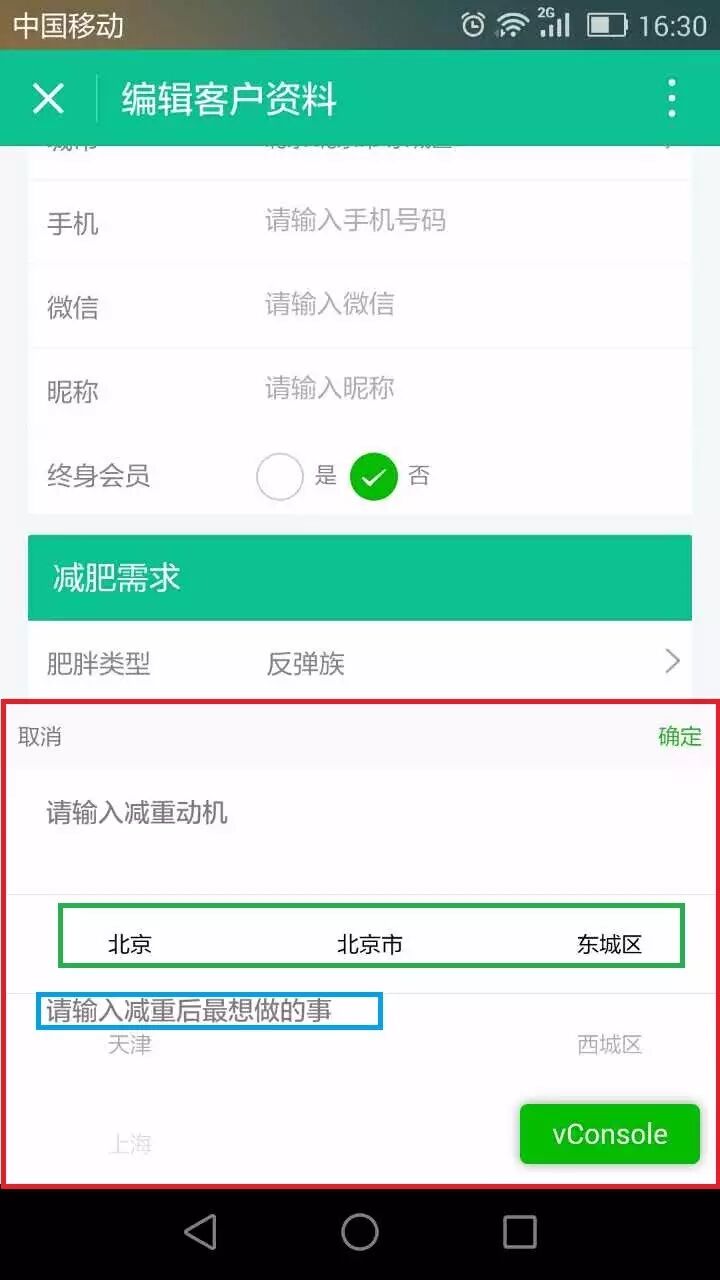 红框部分是地区的picker-view取区域,绿框是一条区域选项,篮框是页面上的textarea的placeholder属性值。弹出picker之后,无法遮罩