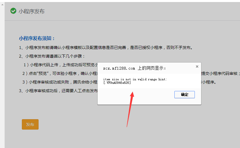 item size is not in valid range hint,我是第三方开发者,现在小程序已通过微信审核了,进入最后一步发布,提示这个报错,哪位高手遇到过?求指导,谢谢!