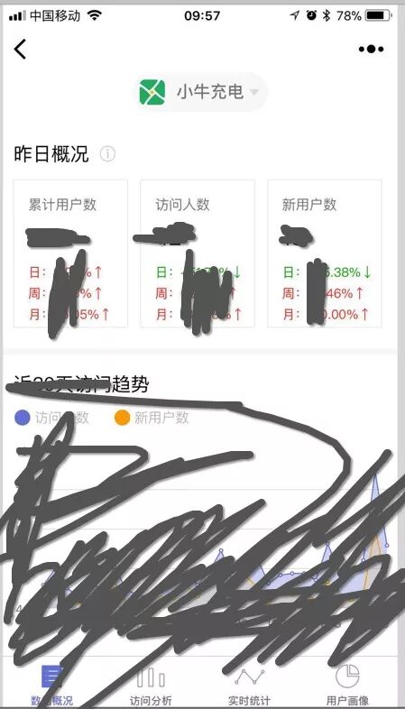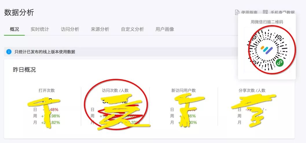 微信公众来台|小程序 数据分析昨日概况 用红色表示减少,绿色表示增加,但是