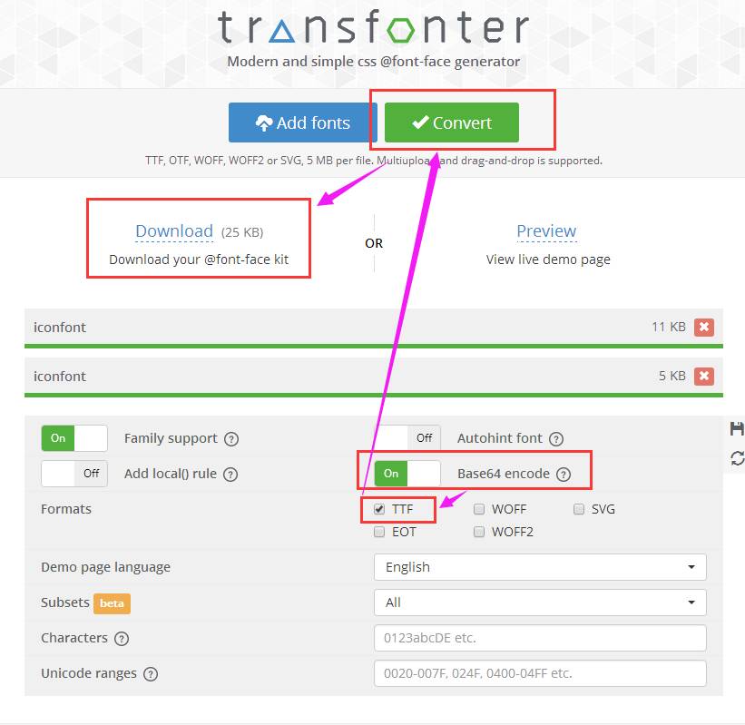 二、到这个平台https://transfonter.org/,把字体文件转化成base64格式