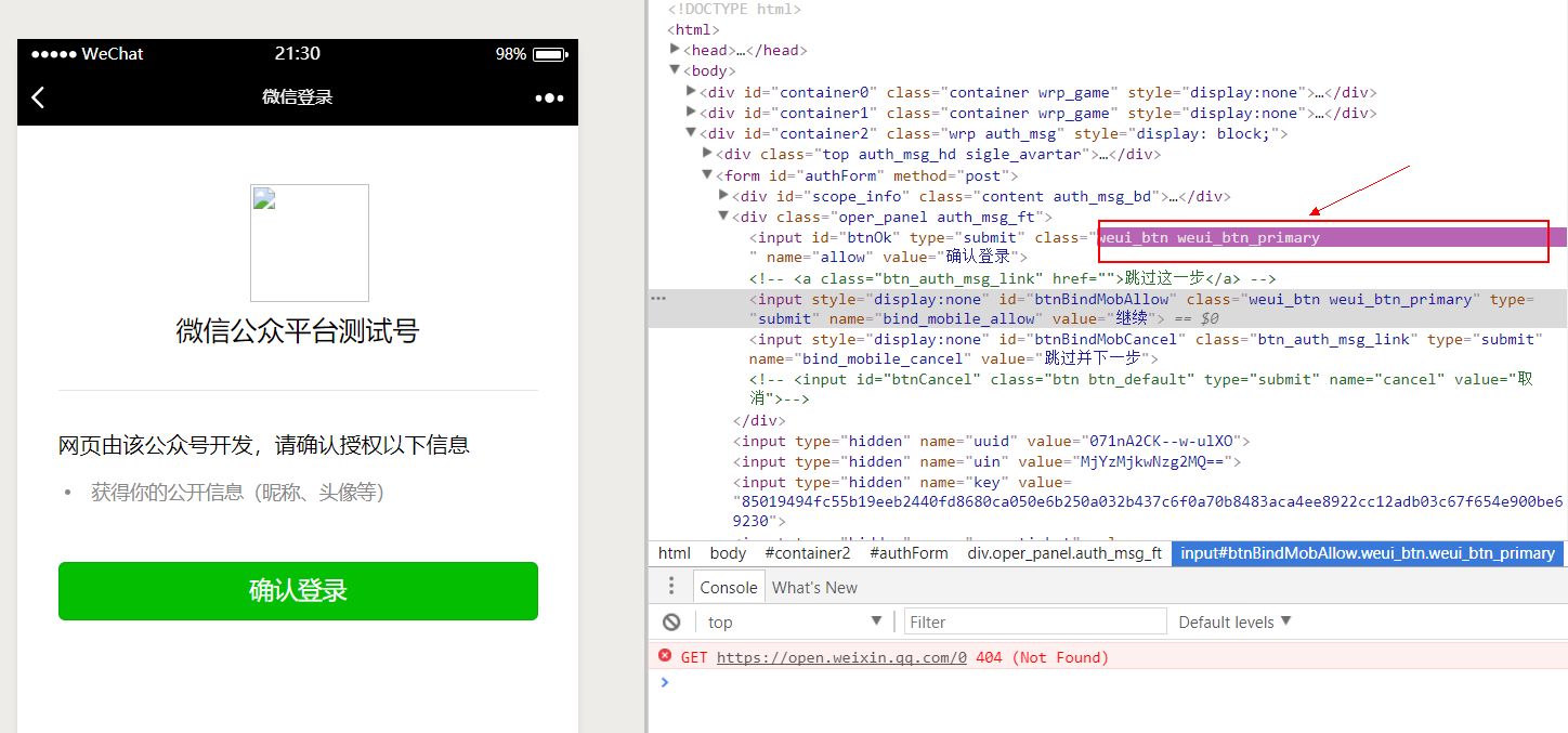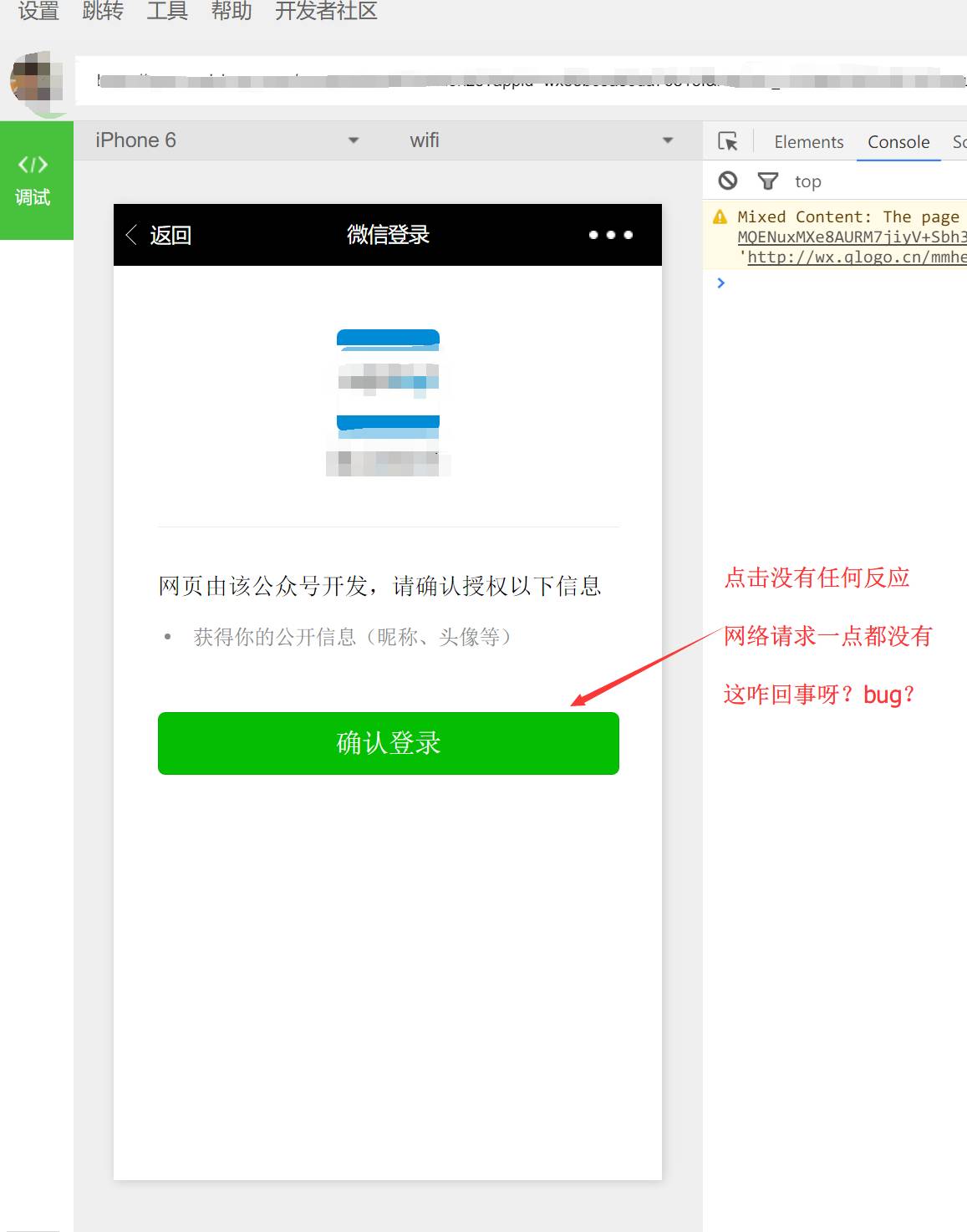开发者工具调试网页授权 确认按钮点击无任何反应!!!