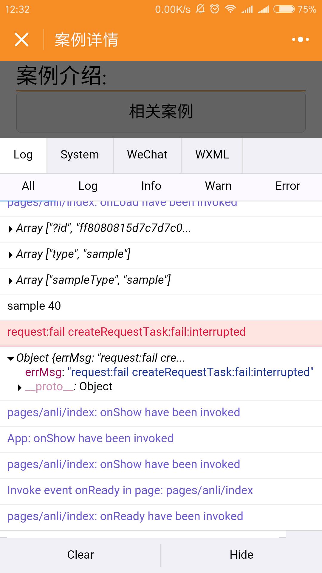 扫码进入案例详情页 onload 方法中请求案例详情数据, 该页面有个相关案例按钮 点击进去相关案例后 关掉小程序 再次扫码进入相同的案例详情页, 就会出现createRequestTask:fail:interrupted的错误 第一次是不会有这个错误的