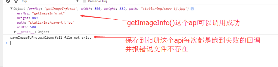 背景:我在小程序的本地static目录存放着目标图片,用户点击时候触发保存这张图片到相册的事件第一个getImageInfo可以调用成功第二个saveImageToPhotosAlbum()每次都失败我个人认为有可能的原因:授权问题 (第一次触发的时候弹出了授权框 我已经点过同意了)路径问题(我用相对路径和绝对路径都试过,但都是一样的结果,也想过是否因为域名验证 在测试环境下加了域名也没效果)求解答,谢谢!