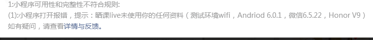 小程序审核反馈不通过。原因是因为打开小程序报错,但是测试的时候从来没有出现过报错啊小程序appid:wx672ce07c249b7262,有没有官方人员说明一下到底怎么报错了,因为测试的时候从来没有报错过,所以现在修改也不知道怎么修改,急,谢谢了