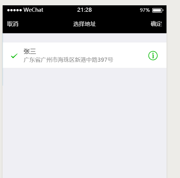 success:{"errMsg":"chooseAddress:ok","userName":"张三","nationalCode":"510000","telNumber":"020-81167888","postalCode":"510000","provinceName":"广东省","cityName":"广州市","countyName":"海珠区","detailInfo":"新港中路397号"}