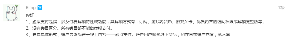 根据你们官方的回复,虚拟支付是指:涉及付费解锁特性或功能,其解锁方式有:订阅、游戏内货币、游戏关卡、优质内容的访问权限或解锁完整版等。