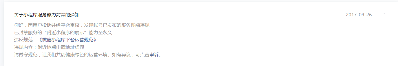 您好,我们连锁旗下某家门店坐标、地址都正确,门店确实存在,被恶意举报后官方不经过查证直接把我们的附近小程序功能永久禁用,申诉半个月苦无结果,求解决方法!