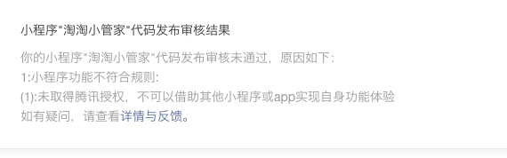 我的这个工具只提供券查询功能没有提示任何用户需要打开任何第三方app 客服人员我希望你们能认真仔细审核,不通过原因永远一句话 不能使用其他小程序或app实现自身功能 能不能给具体原因 ? 再说一遍工具没有提示用户使用任何第三方app 提供的是信息查询功能 !!!!
