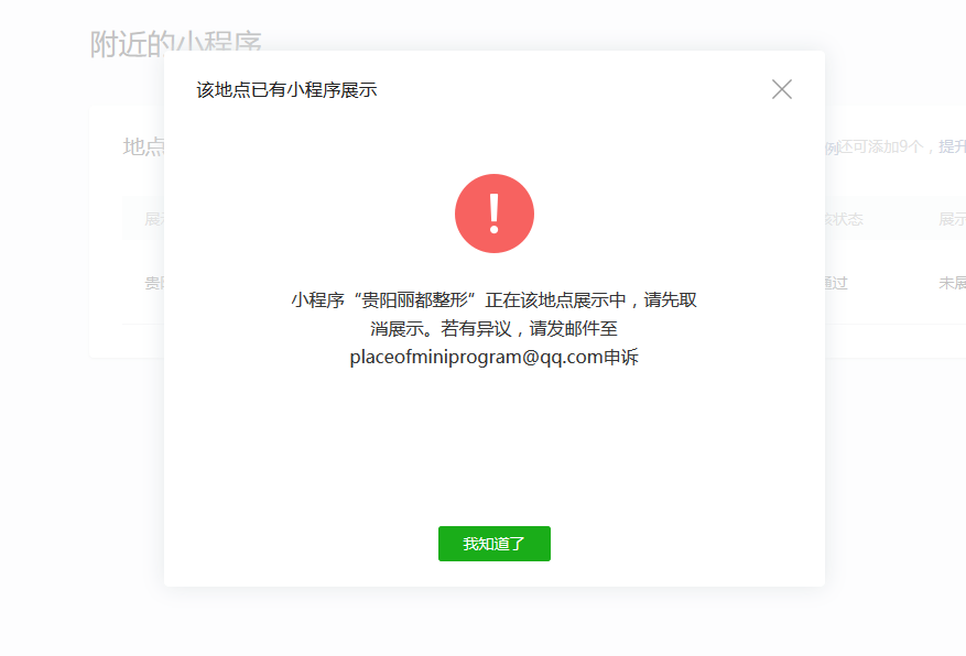 我的小程序想在小程序附近展示,但是提示贵阳丽都整形在该地区展示,我去搜索并没有这个小程序,这个名字是我们的公众号,请问这该怎么弄呢?