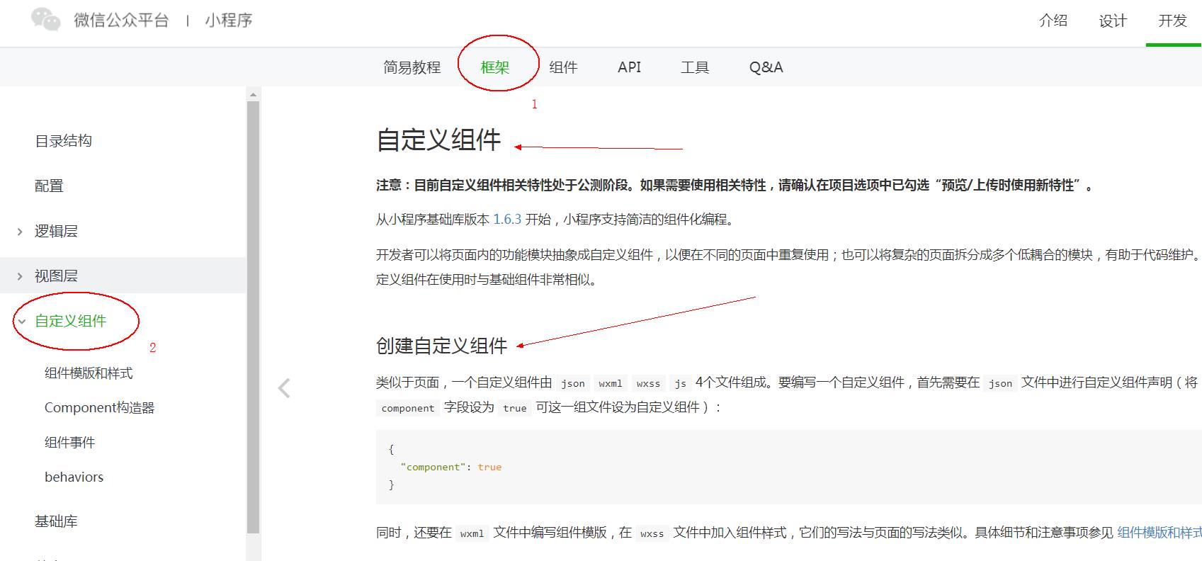 1. 如果你要定义一个组件,就在它的 json 文件里添加 `"component": true`。组件应该尽可能的做到黑箱,一个组件的所有文件都放在一个文件夹内,这样如果你的其它项目要用到组件,只需拷贝这个文件夹,就可以使用该组件了,如果都写在 app.json 中,那么你还得修改 app.json。这种设计反而将组件文件和其它文件耦合在一起。