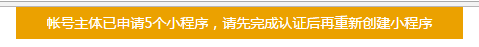 我的公众号的主体都是企业的,不是个体户的,但从公众号里面申请超过5个要再申请就会提示:帐号主体已申请5个小程序,请先完成认证后再重新创建小程序。公众号是认证过的,那这个我要再申请小程序的话,我该怎么弄?之前为了申请多个小程序,一个主体已经重新申请2个公众号,并且都认证了,但同一个主体下申请5个之后,就申请不了了,这是怎么回事啊?
