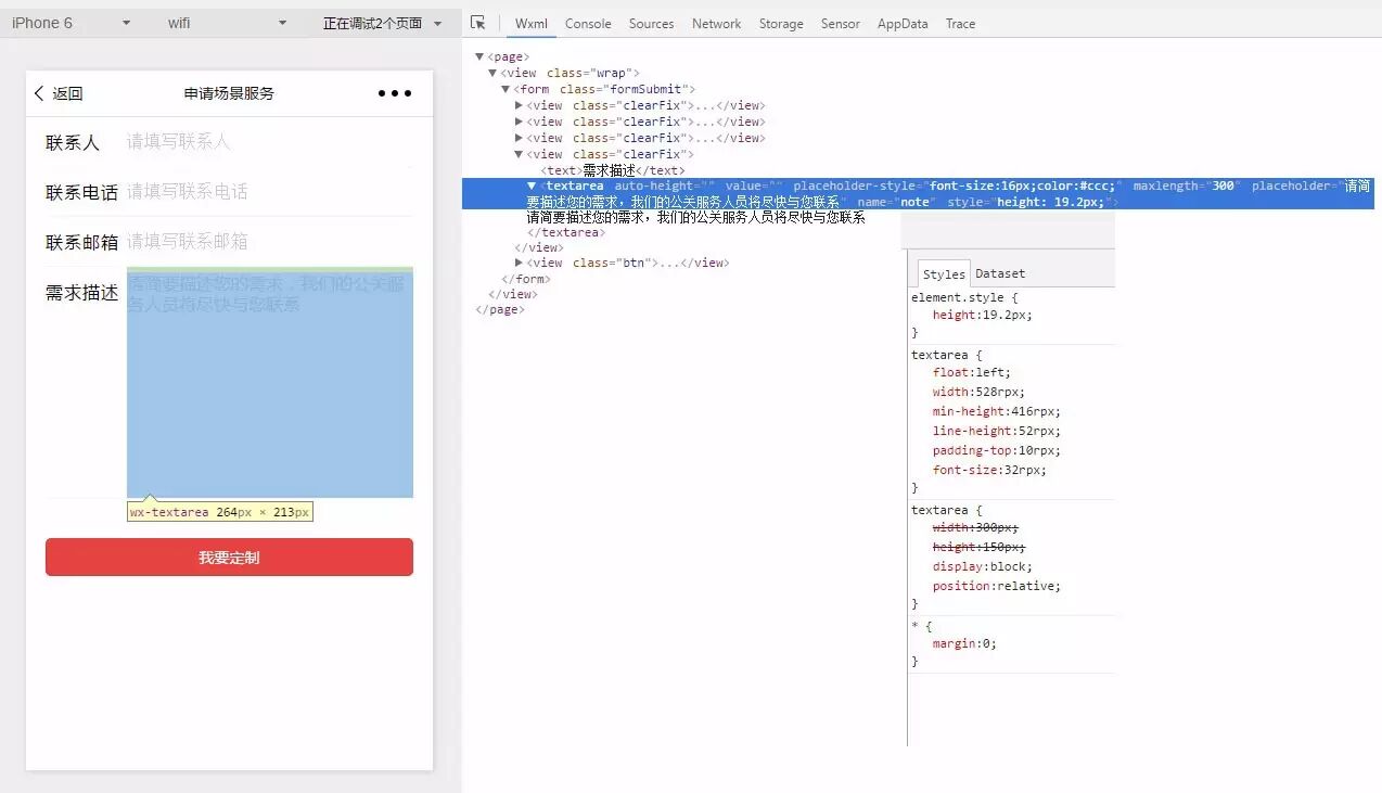 <view class="wrap"> <form bindsubmit="formSubmit" class="formSubmit"> <view class="clearFix"> <text>联系人</text> <input type="text" name="contact" placeholder-style="font-size:16px;color:#ccc;" placeholder="请填写联系人" value="" /> </view> <view class="clearFix"> <text>联系电话</text> <input type="number" name="mobile" placeholder-style="font-size:16px;color:#ccc;" placeholder="请填写联系电话" value="" /> </view> <view class="clearFix"> <text>联系邮箱</text> <input type="text" name="email" placeholder-style="font-size:16px;color:#ccc;" placeholder="请填写联系邮箱" value="" /> </view> <view class="clearFix"> <text>需求描述</text> <textarea style="height:36px;" maxlength="300" name="note" placeholder-style="font-size:16px;color:#ccc;" placeholder="请简要描述您的需求,我们的公关服务人员将尽快与您联系" auto-height value="" /> </view> <view class="btn"> <button formType="submit" type="warn" hover-class="none">我要定制</button> </view> </form></view> |