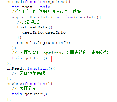 在本页面的onload和onShow方法中调用getUser获取信息