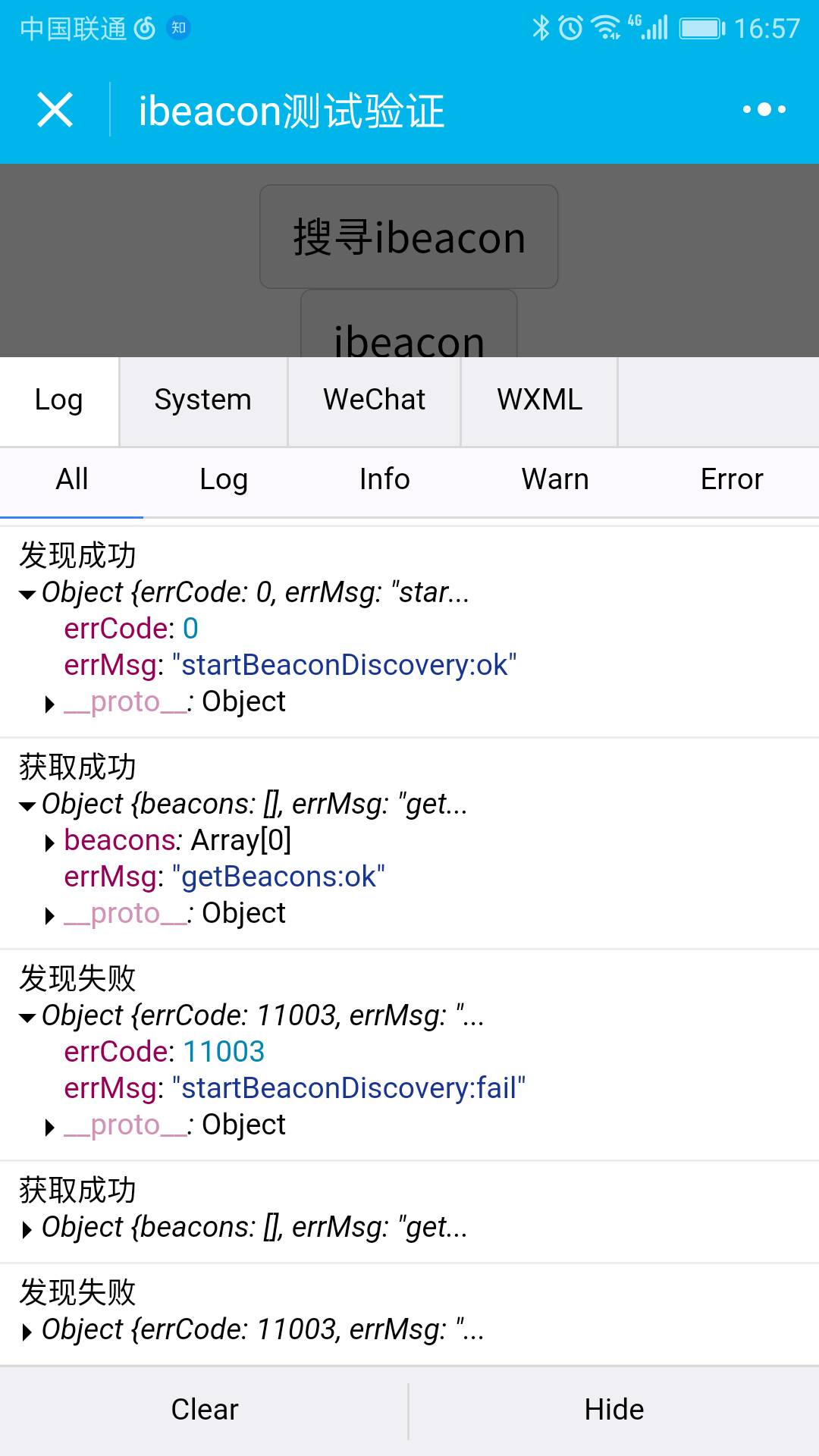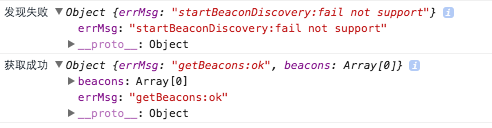 以下是在开发者工具上,wx.startBeaconDiscovery和wx.getBeacons API接口打印出来的信息: