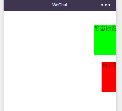 <movable-area style="height:900rpx;width:1050rpx;border:1px solid #fff;left:-150rpx;"> <movable-view direction="all" style="height:200rpx;width:300rpx;;background-color:#0f0;" x="200" y="0"> <text>静态标签</text> </movable-view> <movable-view wx:for="{{1}}" direction="all" style="height:200rpx;width:400rpx;;background-color:#f00;" x="200" y="200"> <text>动态标签</text> </movable-view></movable-area> |