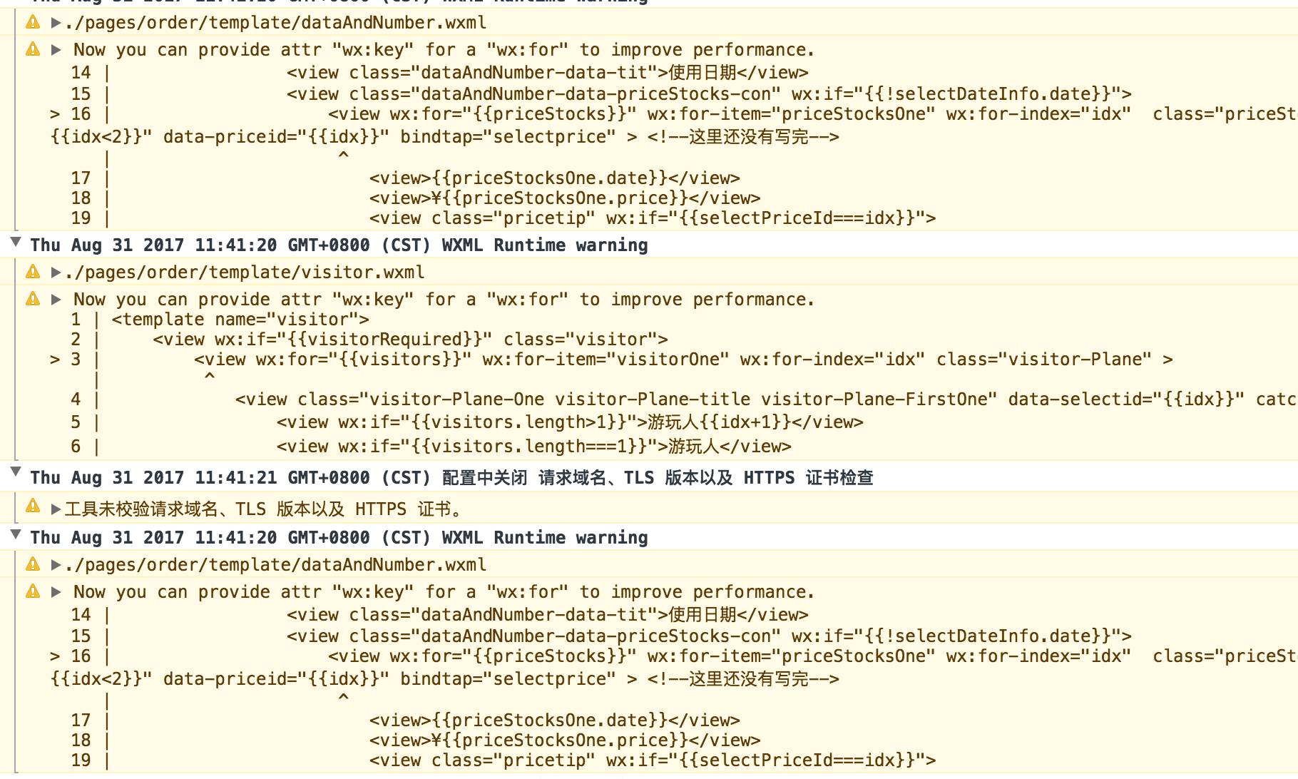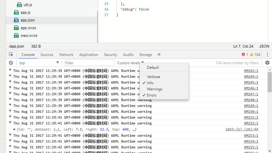 设置了debug=false,在console中还是会显示warning信息,因为我在wxml里面的wx:for 没有设置key,所以会有很多的warning,我把console中的warning都关掉了,还是有下面这种信息。