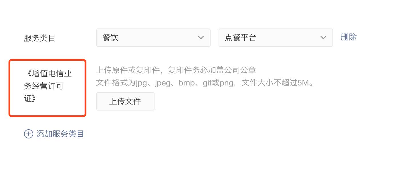 根据微信要求,选择【餐饮】-【点餐平台】,需要提交《增值电信业务经营许可证》。