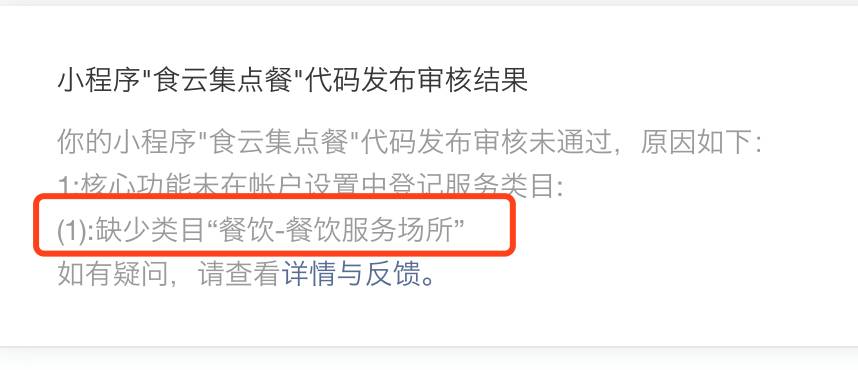 我们是为美食广场提供在线点餐服务,这个在线点餐的类目之前是认证通过的,且我们一直以来就是使用这个服务类目提交代码的,业务上一直没有新增。