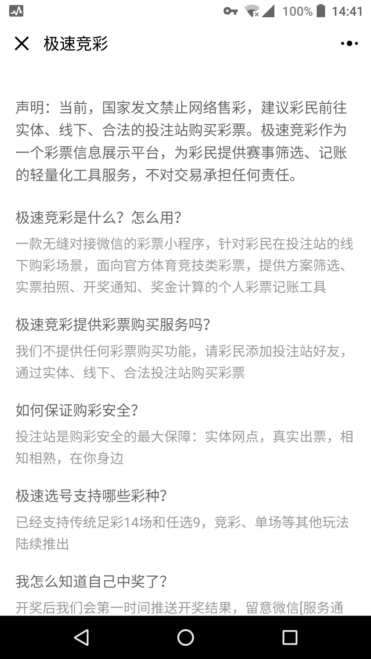 2.数据:极速竞彩作为效率工具在提供给彩民进行使用,为彩民提供购彩情况记录及开奖通知的功能,其中未涉及彩票销售及支付相关功能,其数据均来自中国体育彩票官方网站,已在小程序介绍中说明;