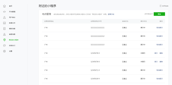 或登录小程序后台,进入“附近的小程序”,开通功能后,添加地点。