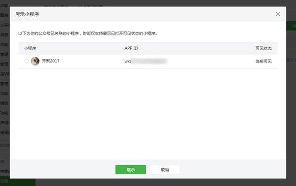 在小程序后台若地点已有别的小程序展示,你的小程序不会自动展示。请先把展示中的小程序取消展示,再操作你的小程序展示。