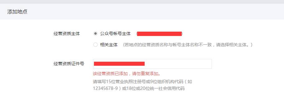 另外,我在手工添加第二家门店的时候,输入了经营资质证件号,却报出了如下错误:“该经营资质已添加,请勿重复添加”。但是我们1000家店都是同一个经营资质主体啊,怎么解决呢?