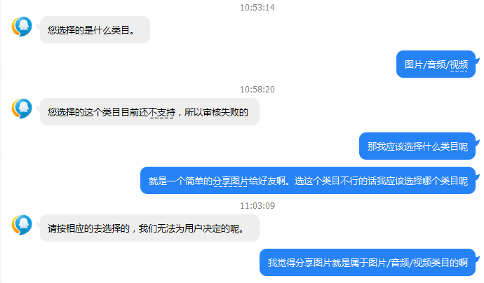 这次审核失败的原因比较模糊,所以问了在线客服,如截图。