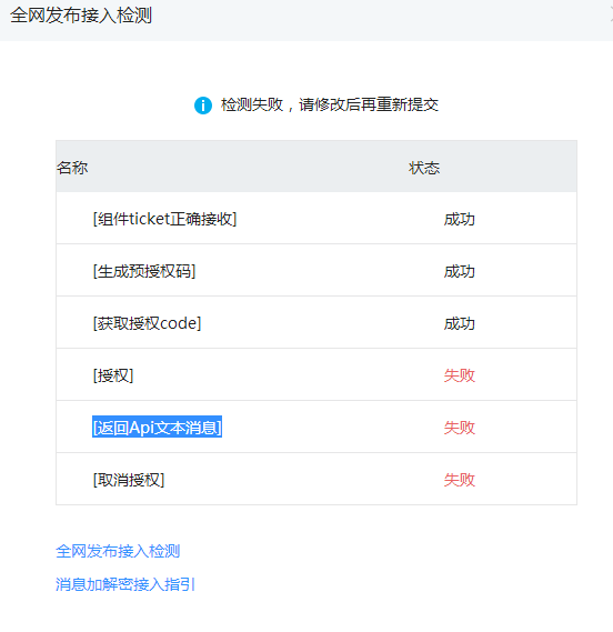 1、选择了小程序的三个权限,分别是“帐号管理权限”、“开发管理与数据分析权限”、“客服消息管理权限”,这时候全网发布就失败,并且我在“授权事件接收URL”和“公众号消息与事件接收URL”中加了log日志,也没有执行到,是在页面加载的地方,说明,微信没有调用到我的接口。失败结果如下:
