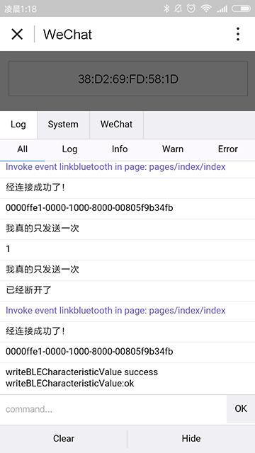 我的le2,FastBLE扫描到设备后不连接,小程序扫描到设备后连,再用FastBLE连接设备,竟然可以连接上还可一发数据,不进行断开操作,回到小程序竟然也可以发数据!难道我连的设备是1:M模式!