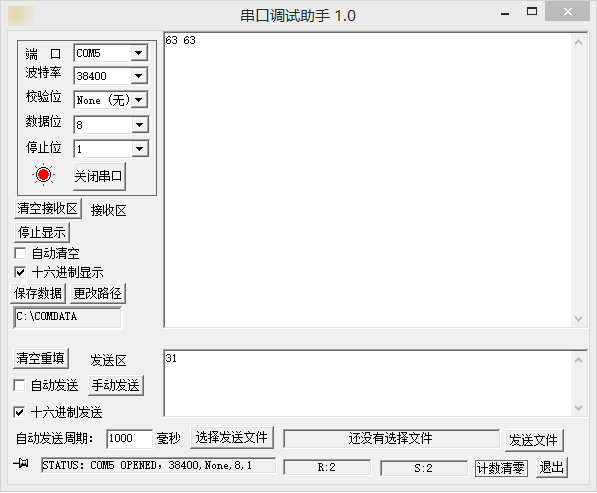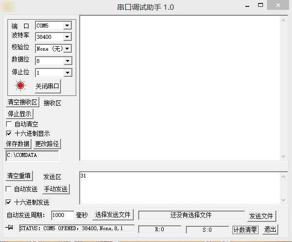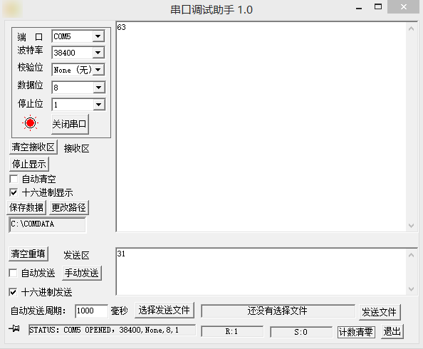 串口已经连接到了蓝牙模块,最后一行R:0是电脑接收到的字节,S:0是发送的给蓝牙的字节,刚开始都是0