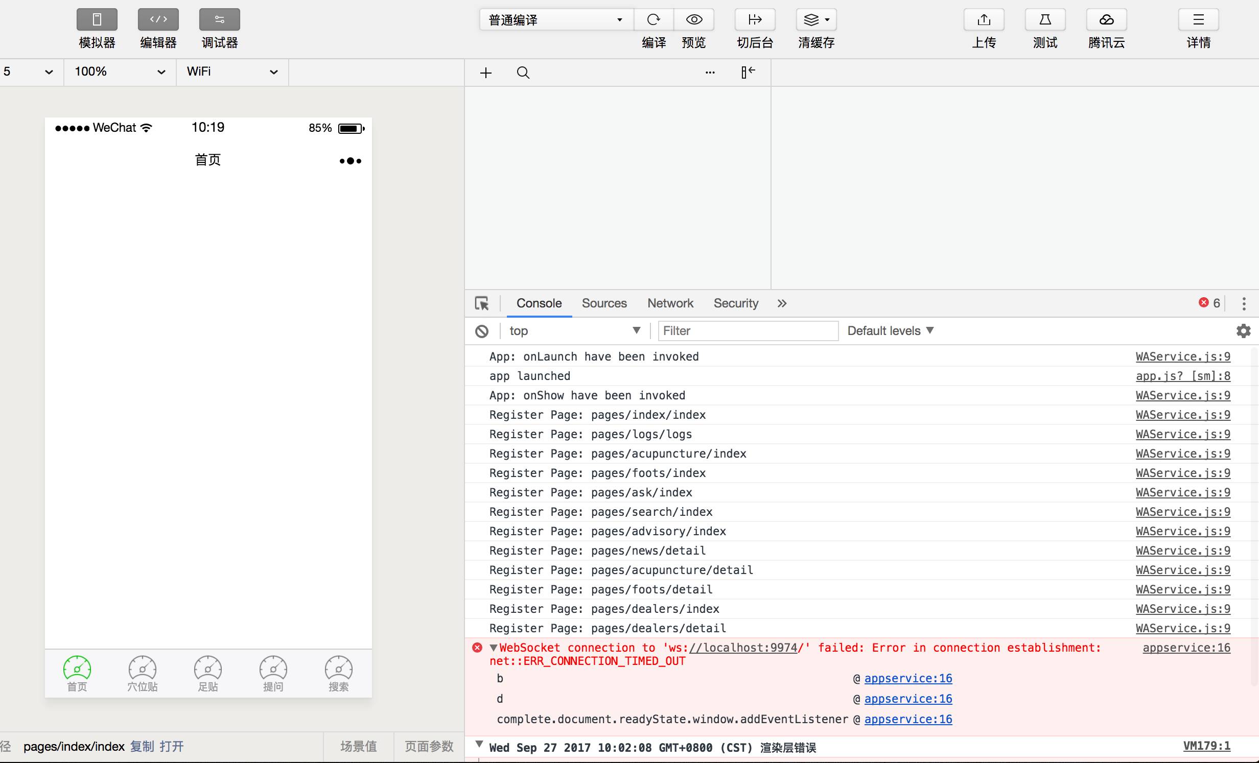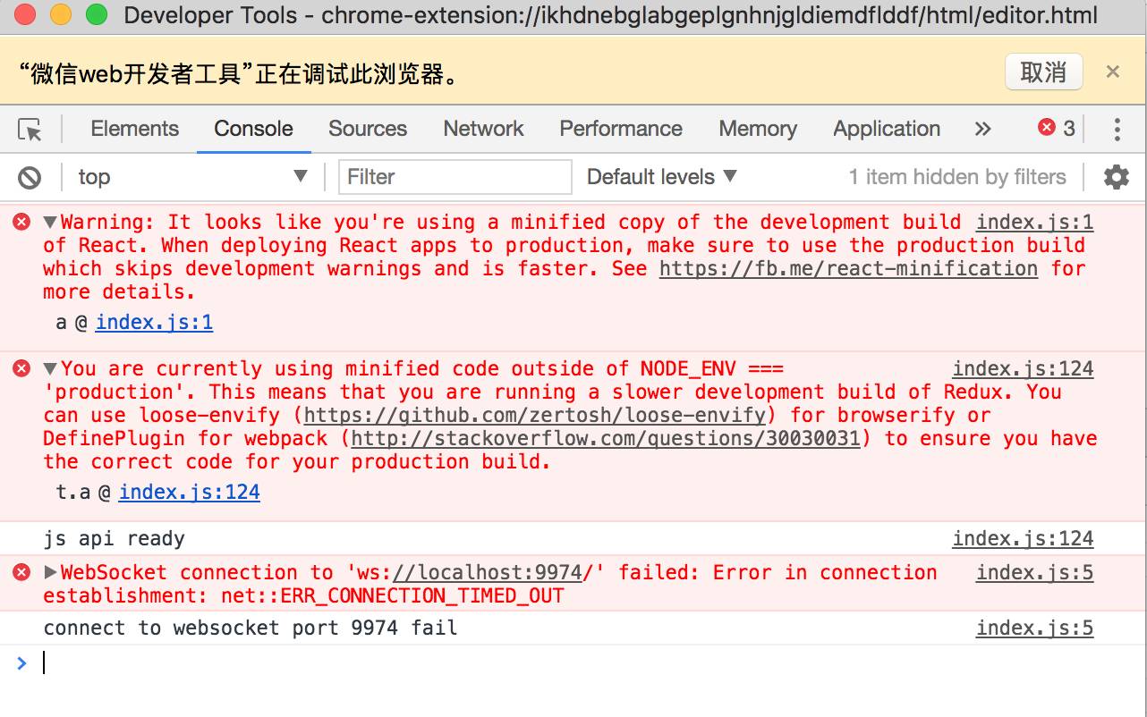 为了定位问题,分别点击这里的 “调试微信开发者工具” 和 “调试编辑器”,然后分别切换到 console 标签,可以提供截图吗,感谢。