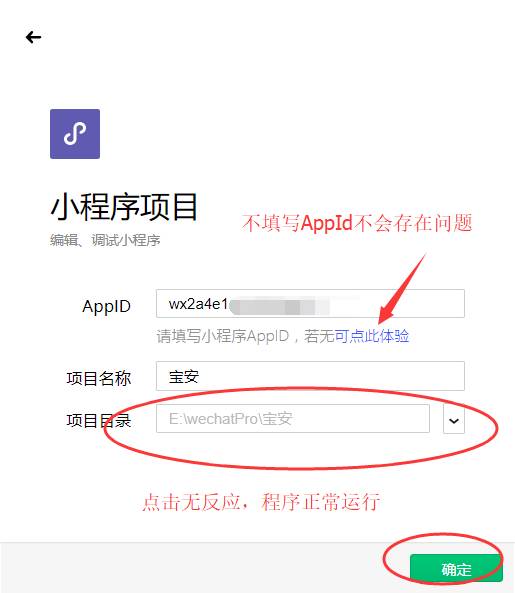如果补填写AppId的情况下,可以进行项目的添加,填写了如上图,程序正常运行,点击确定没反应