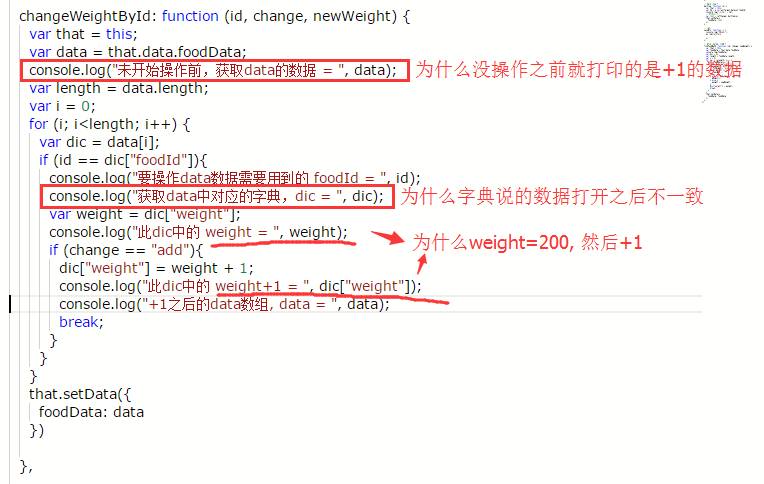 哦,忘记说了,它能正常加减也行,但是,我之后再点击加减按钮的时候,这个打印数据就不会改变了,一直都是打印的如问题中提问的内容。 setData({})感觉就第一次用到了。 但是实际情况是,界面上input中的内容,在我点击加减的时候,会有个瞬间从200变为201的过程。 也就是说,每次我点加减按钮的时候,weight的初始值都是200, 无语。