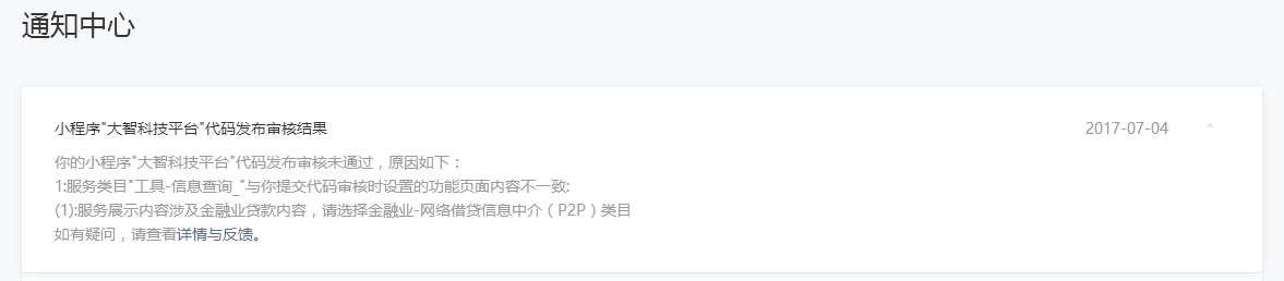 你们审核不通过的主要原因,是把我们的小程序定义为是“网络借贷信息中介(P2P)”类目,需要我们提供相应的资质文件,而我们因为不是这类机构,所以没有相应的资质文件。