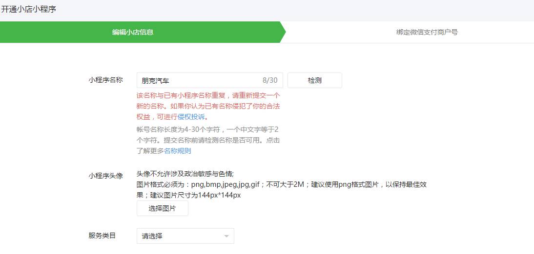 在微信公众平台添加微信小店小程序,在编辑小店信息后,进入第二步提醒开通微信支付,但点击后就出现这个页面,导致申请【朋克汽车】微信小程序无法找回,再次使用这个名字,就提示重名,请帮忙解决!!!