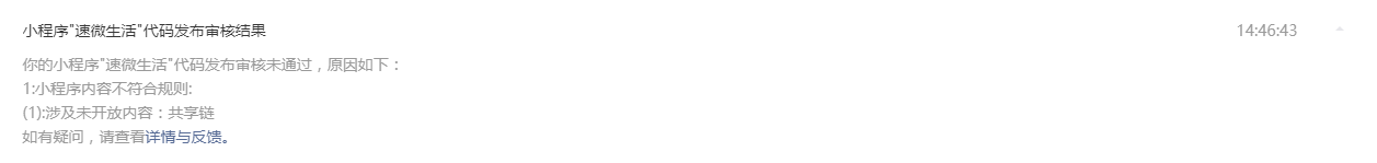 我已经将所有的共享链改为共享 速微生活了。 里面就一个查询优惠券功能,和一个客服功能,到底是那一块涉及到未开放内容共享链 AppID: wx6d19e05aedeabae2