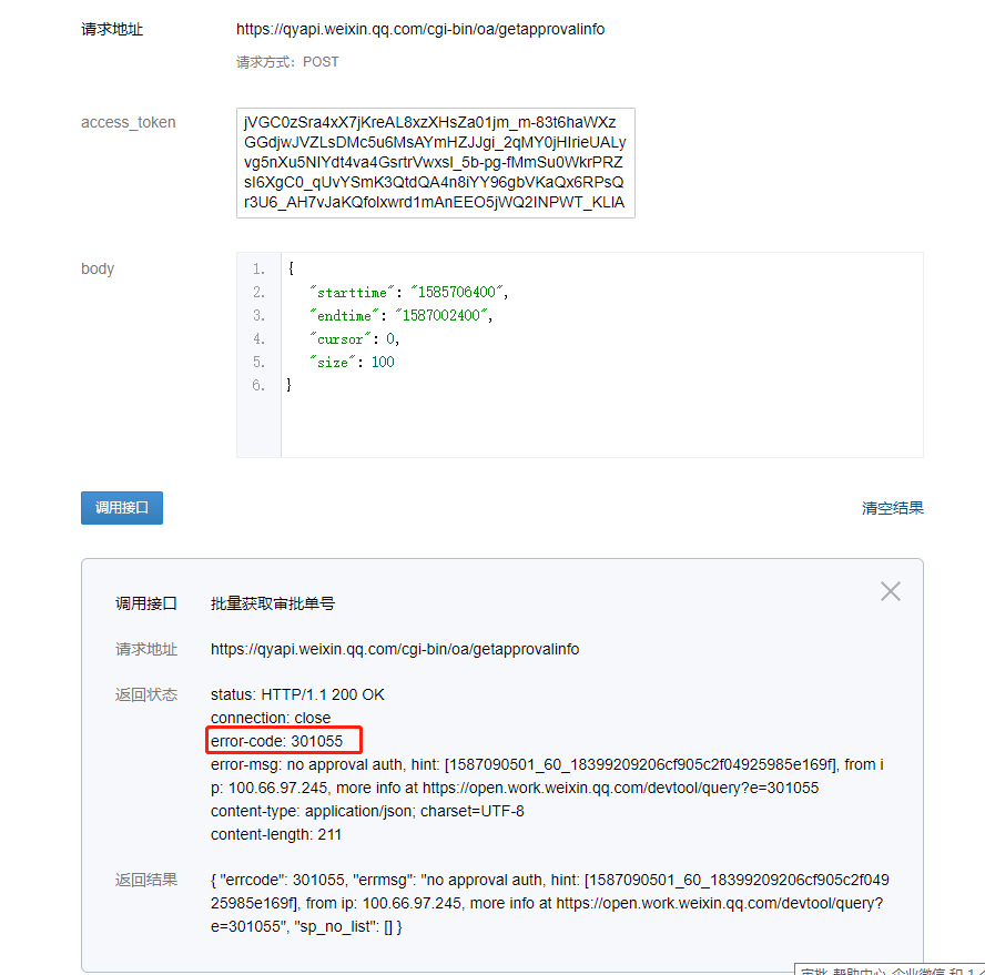 { "errcode": 301055, "errmsg": "no approval auth, hint: [1591868976_61_83291fa74cb99a88f4b528003cfb8993], from ip: 111.19.255.37, more info at https://open.work.weixin.qq.com/devtool/query?e=301055" }